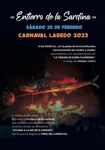 El sábado 25 de febrero, Laredo se vestirá de luto para el Entierro de la Sardina. Viudos y viudas se reunirán a las 20:00 horas en la Plaza de la Constitución y asistirán a la representación de “La tiranía de Doña Cuaresma” a cargo de Aldaba Teatro. A continuación, dará comienzo el Entierro de la Sardina, que será conducida hasta la Playa La Salvé, donde se recitará la “Letanía a la difunta sardina”, con la que el Carnaval llegará a su fin.