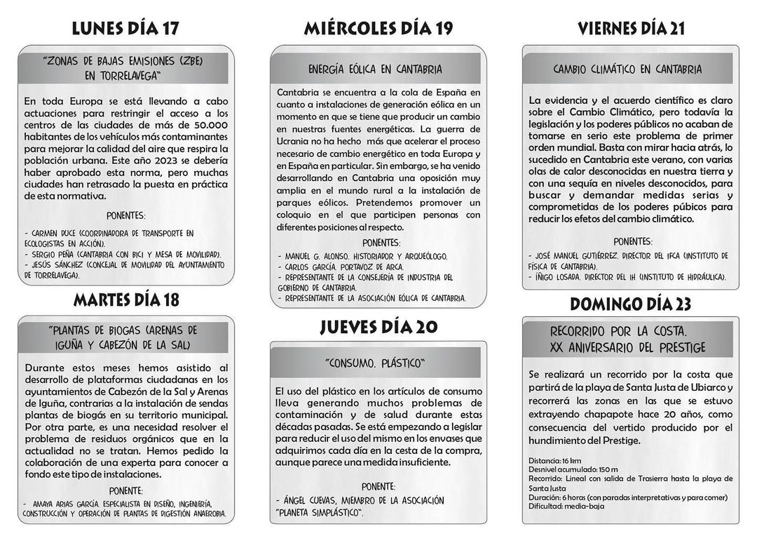 Detalles de EventoDate: 17 abril, 2023 19:30 – 23 abril, 2023 18:30Lugar de encuentro: Bº CovadongaCategorías: CulturaEtiquetas: Barrio Covadonga, cultura, Torrelavega23 Semana de ecología y medio ambientePrograma 23 Semana de ecología y medio ambiente ¿Nos ayudas a mantener miplanhoy.com?Mantener miplanhoy.com no es fácil y gracias a tu donación podremos seguir informándote de los eventos y planes para hacer en Cantabria. SUSCRÍBETESuscríbete a nuestro boletín de noticias y entérate de los mejores eventos y actividades en Cantabria Correo electrónico Please wait... Suscribirte ¡Gracias por suscribirte! QUÉ HACER EN CANTABRIA…HoyMañanaEl fin de semanaEl viernesEl sábadoEl domingoEsta semanaElegir un día diciembre 2025LMXJVSD 1 2 3 4 5 6 7 8 9 10 11 12 13 14 15 16 17 18 19 20 21 22 23 24 25 26 27 28 29 30 31 « Nov Ene » MERCADILLOS SEMANALES EN CANTABRIAMercados en Cantabria durante la semana TE INTERESAHoróscopo 10 de Marzo 2024Dónde celebrar la Feria de Abril en Cantabria 2024Programación Sala Niagara Febrero 2024CARTELERASSALAS DE CONCIERTOSala NiagaraRock-Beer The New