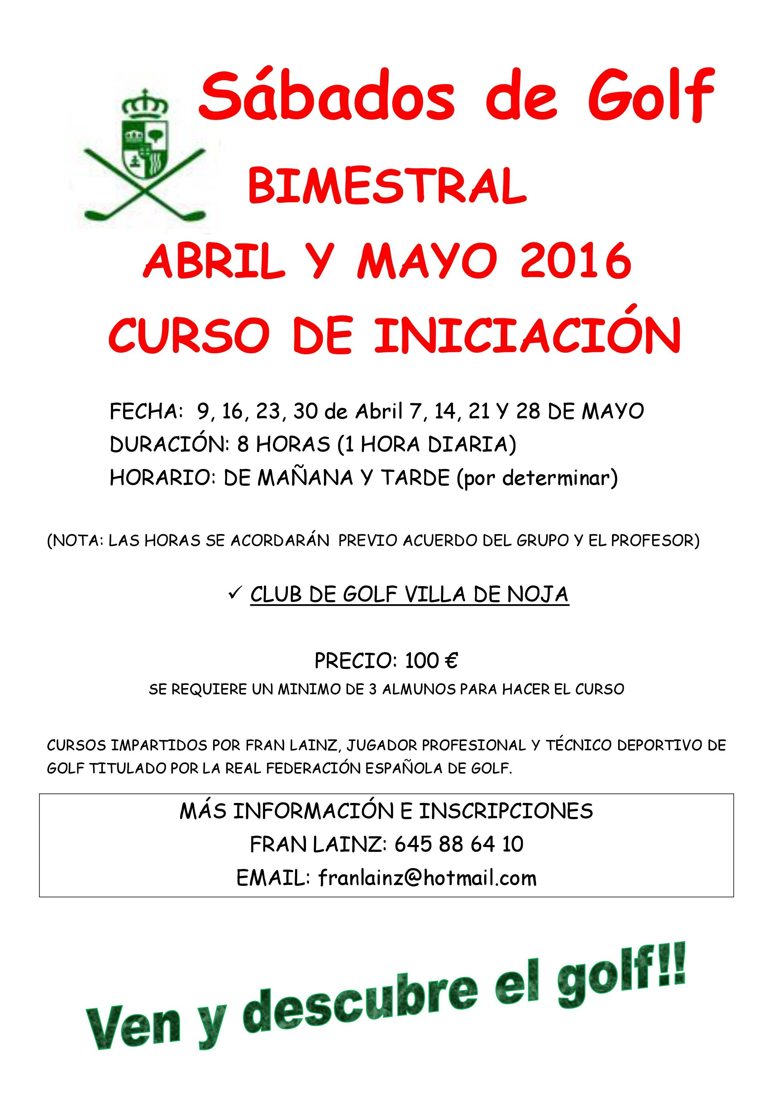 Detalles de EventoEste evento terminó el 29 mayo 2016Lugar de encuentro: Campo de Golf La JunqueraCategorías: Deportes, Espectáculos, Fiesta, NiñosEtiquetas: Cursos, golf, nojaCursos de Golf en Noja y Pedreña. Toda la info en los carteles ¿Nos ayudas a mantener miplanhoy.com?Mantener miplanhoy.com no es fácil y gracias a tu donación podremos seguir informándote de los eventos y planes para hacer en Cantabria. SUSCRÍBETESuscríbete a nuestro boletín de noticias y entérate de los mejores eventos y actividades en Cantabria Correo electrónico Please wait... Suscribirte ¡Gracias por suscribirte! QUÉ HACER EN CANTABRIA…HoyMañanaEl fin de semanaEl viernesEl sábadoEl domingoEsta semanaElegir un día noviembre 2025LMXJVSD 1 2 3 4 5 6 7 8 9 10 11 12 13 14 15 16 17 18 19 20 21 22 23 24 25 26 27 28 29 30« Oct Dic » MERCADILLOS SEMANALES EN CANTABRIAMercados en Cantabria durante la semana TE INTERESAHoróscopo 10 de Marzo 2024Dónde celebrar la Feria de Abril en Cantabria 2024Programación Sala Niagara Febrero 2024CARTELERASSALAS DE CONCIERTOSala NiagaraRock-Beer The New