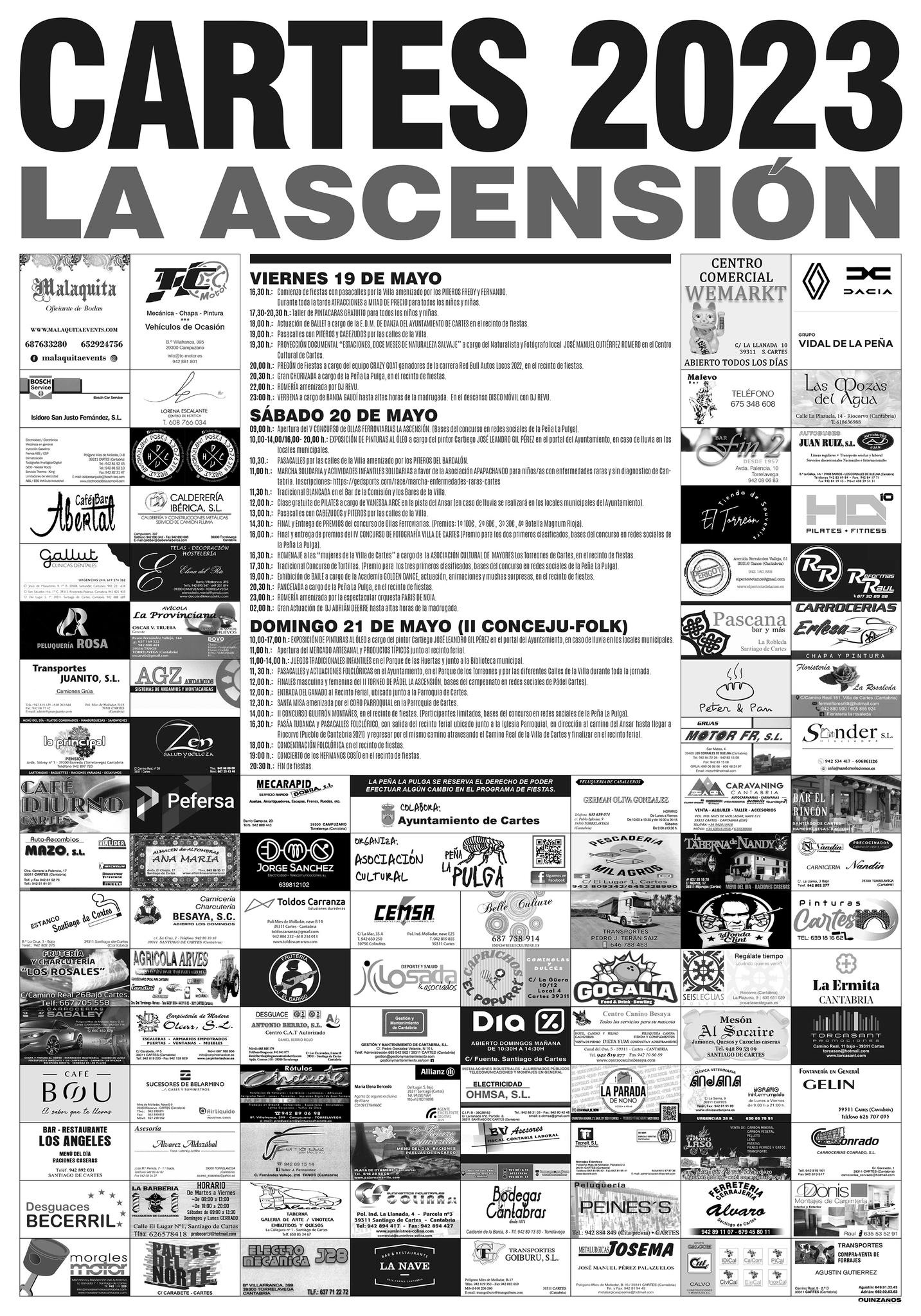 Detalles de Evento Este evento terminó el 21 mayo 2023 Lugar de encuentro: Cartes Categorías: Fiesta, Fiestas locales Etiquetas: Cartes, Fiestas de la Ascensión, fiestas locales, fiestas populares Fiestas de la Ascensión Cartes 2023 Programa Fiestas de la Ascensión Cartes 2023 Eventos que pueden interesarte:Juicio en el Fondo del Mar Santoña 2026Juicio en el Fondo del Mar Santoña 2026 ¿Nos ayudas a mantener miplanhoy.com?Mantener miplanhoy.com no es fácil y gracias a tu donación podremos seguir informándote de los eventos y planes para hacer en Cantabria. SUSCRÍBETESuscríbete a nuestro boletín de noticias y entérate de los mejores eventos y actividades en Cantabria Correo electrónico Please wait... Suscribirte ¡Gracias por suscribirte! QUÉ HACER EN CANTABRIA…Hoy Mañana El fin de semana El viernes El sábado El domingo Esta semana Elegir un día febrero 2026 LMXJVSD 1 2 3 4 5 6 7 8 9 10 11 12 13 14 15 16 17 18 19 20 21 22 23 24 25 26 27 28 « Ene Mar » MERCADILLOS SEMANALES EN CANTABRIAMercados en Cantabria durante la semana TE INTERESA Horóscopo 10 de Marzo 2024 Dónde celebrar la Feria de Abril en Cantabria 2024 Programación Sala Niagara Febrero 2024 CARTELERASSALAS DE CONCIERTOSala NiagaraRock-Beer The New