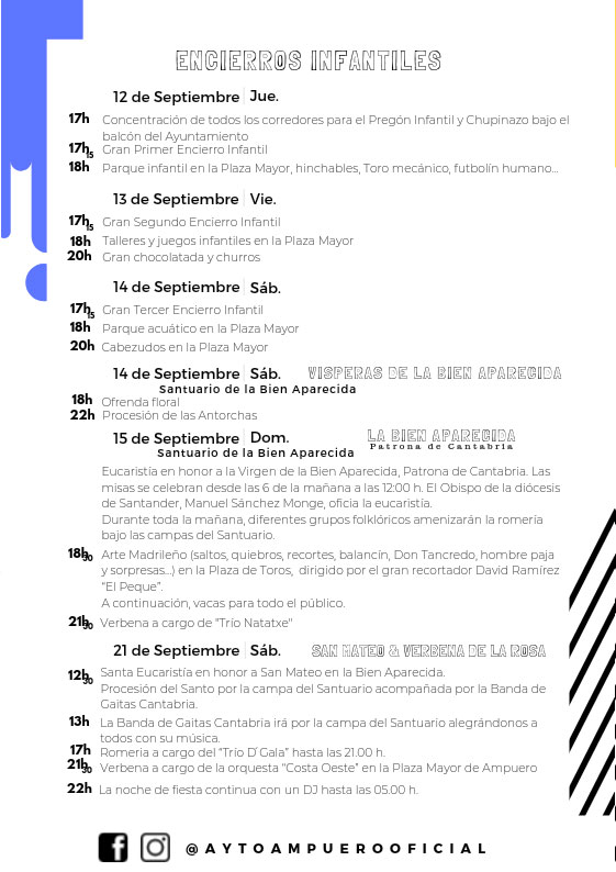 Detalles de Evento Este evento terminó el 21 septiembre 2019 Lugar de encuentro: Ampuero Categorías: Actuaciones, Espectáculos, Fiesta, Fiestas locales, Gastronomía, GRATIS, Música y conciertos, Niños Etiquetas: Ampuero, fiestas, La Virgen Niña Fiestas de La Virgen Niña en Ampuero 2019. ¿Nos ayudas a mantener miplanhoy.com?Mantener miplanhoy.com no es fácil y gracias a tu donación podremos seguir informándote de los eventos y planes para hacer en Cantabria. SUSCRÍBETESuscríbete a nuestro boletín de noticias y entérate de los mejores eventos y actividades en Cantabria Correo electrónico Please wait... Suscribirte ¡Gracias por suscribirte! QUÉ HACER EN CANTABRIA…Hoy Mañana El fin de semana El viernes El sábado El domingo Esta semana Elegir un día febrero 2026 LMXJVSD 1 2 3 4 5 6 7 8 9 10 11 12 13 14 15 16 17 18 19 20 21 22 23 24 25 26 27 28 « Ene Mar » MERCADILLOS SEMANALES EN CANTABRIAMercados en Cantabria durante la semana TE INTERESA Horóscopo 10 de Marzo 2024 Dónde celebrar la Feria de Abril en Cantabria 2024 Programación Sala Niagara Febrero 2024 CARTELERASSALAS DE CONCIERTOSala NiagaraRock-Beer The New