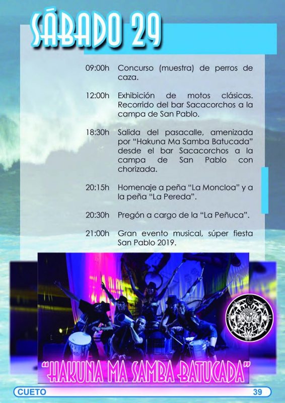 Detalles de EventoDate: 27 – 30 junio, 2019Lugar de encuentro: CuetoCategorías: Espectáculos, Fiesta, Fiestas locales, GRATIS, Música y conciertos, NiñosEtiquetas: cueto, fiestas, San Pablo, SantanderFiestas de San Pablo en Cueto,Santander 2019 Eventos que pueden interesarte:Fiestas Bernales 2025Rosalía LUX Tour 2026: Fechas, ciudades, entradas y todo lo que debes saberLa Gran Champanada Santander 2025"Retrato de un Albarquero" ¿Nos ayudas a mantener miplanhoy.com?Mantener miplanhoy.com no es fácil y gracias a tu donación podremos seguir informándote de los eventos y planes para hacer en Cantabria. SUSCRÍBETESuscríbete a nuestro boletín de noticias y entérate de los mejores eventos y actividades en Cantabria Correo electrónico Please wait... Suscribirte ¡Gracias por suscribirte! QUÉ HACER EN CANTABRIA…HoyMañanaEl fin de semanaEl viernesEl sábadoEl domingoEsta semanaElegir un día diciembre 2025LMXJVSD 1 2 3 4 5 6 7 8 9 10 11 12 13 14 15 16 17 18 19 20 21 22 23 24 25 26 27 28 29 30 31 « Nov Ene » MERCADILLOS SEMANALES EN CANTABRIAMercados en Cantabria durante la semana TE INTERESAHoróscopo 10 de Marzo 2024Dónde celebrar la Feria de Abril en Cantabria 2024Programación Sala Niagara Febrero 2024CARTELERASSALAS DE CONCIERTOSala NiagaraRock-Beer The New