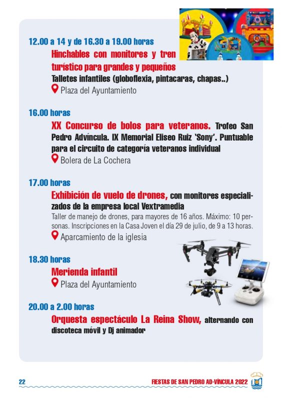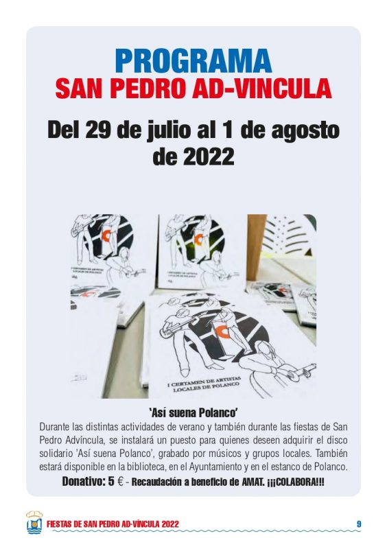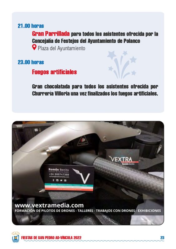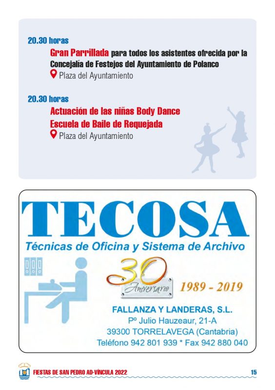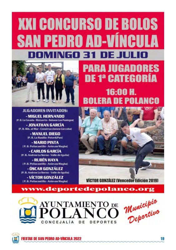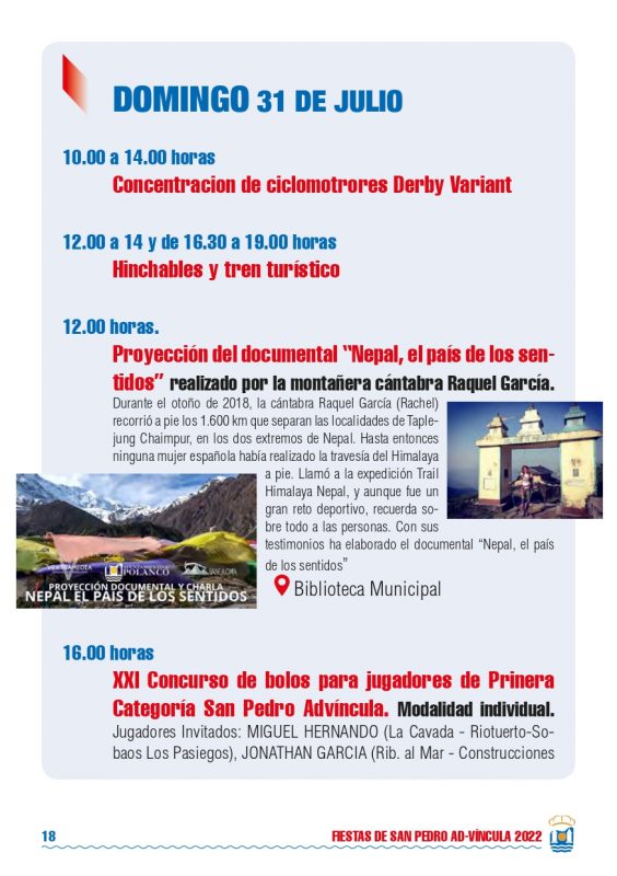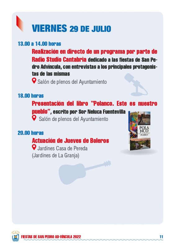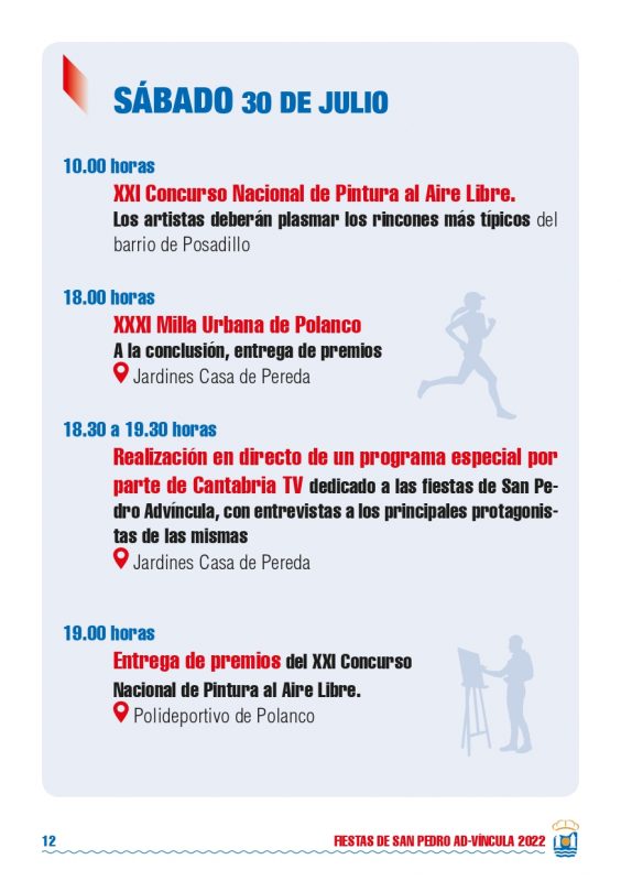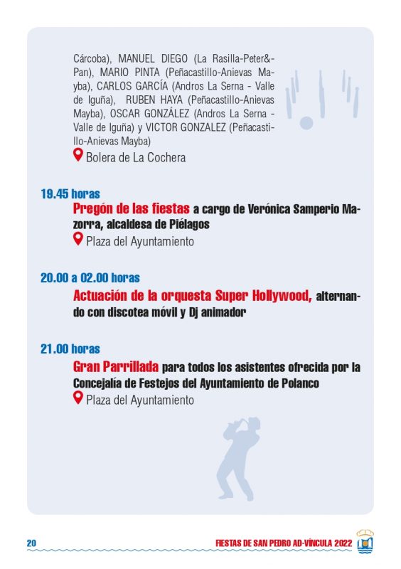 Detalles de EventoDate: 29 julio – 1 agosto, 2022Lugar de encuentro: PolancoCategorías: Fiesta, Fiestas localesEtiquetas: Fiestas de San Pedro 2022, fiestas locales, fiestas populares, PolancoFiestas de San Pedro 2022 – PolancoPrograma Fiestas de San Pedro 2022 – Polanco Eventos que pueden interesarte:Fiestas Bernales 2025Rosalía LUX Tour 2026: Fechas, ciudades, entradas y todo lo que debes saber ¿Nos ayudas a mantener miplanhoy.com?Mantener miplanhoy.com no es fácil y gracias a tu donación podremos seguir informándote de los eventos y planes para hacer en Cantabria. SUSCRÍBETESuscríbete a nuestro boletín de noticias y entérate de los mejores eventos y actividades en Cantabria Correo electrónico Please wait... Suscribirte ¡Gracias por suscribirte! QUÉ HACER EN CANTABRIA…HoyMañanaEl fin de semanaEl viernesEl sábadoEl domingoEsta semanaElegir un día diciembre 2025LMXJVSD 1 2 3 4 5 6 7 8 9 10 11 12 13 14 15 16 17 18 19 20 21 22 23 24 25 26 27 28 29 30 31 « Nov Ene » MERCADILLOS SEMANALES EN CANTABRIAMercados en Cantabria durante la semana TE INTERESAHoróscopo 10 de Marzo 2024Dónde celebrar la Feria de Abril en Cantabria 2024Programación Sala Niagara Febrero 2024CARTELERASSALAS DE CONCIERTOSala NiagaraRock-Beer The New