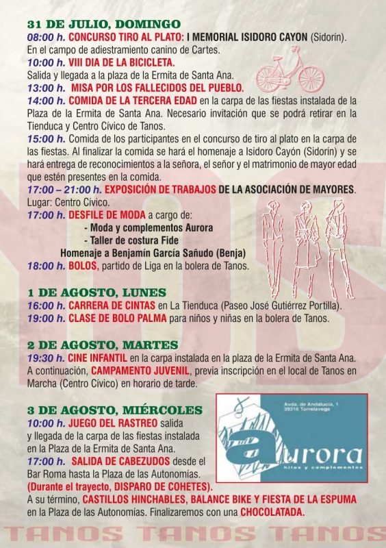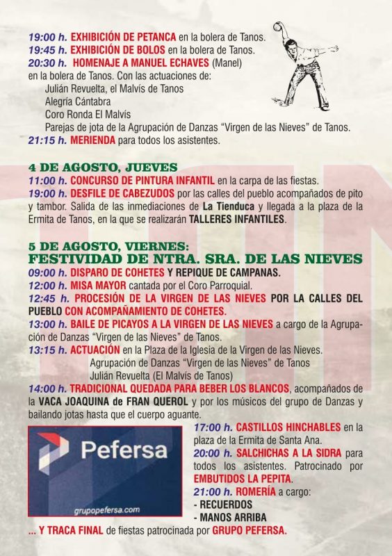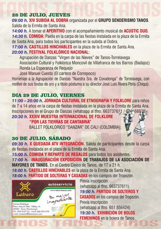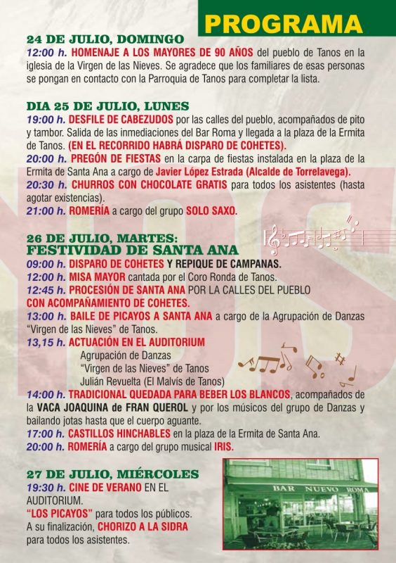 Detalles de EventoDate: 24 julio – 5 agosto, 2022Lugar de encuentro: TanosCategorías: Fiesta, Fiestas localesEtiquetas: fiestas locales, fiestas populares, Santa Ana 2022, tanosFiestas de Santa Ana Y Ntra. Señora de las Nieves 2022 – TanosPrograma Fiestas de Tanos 2022 Eventos que pueden interesarte:Presentación Mareas - Sarón 2025XVII CAMPEONATO DE KAYAK EXTREMO ASÓN Y GÁNDARA 2025Presentación libro 1925-2025 SOCIEDAD CORAL DE TORRELAVEGAConcierto The Spitters Santander 2025 ¿Nos ayudas a mantener miplanhoy.com?Mantener miplanhoy.com no es fácil y gracias a tu donación podremos seguir informándote de los eventos y planes para hacer en Cantabria. SUSCRÍBETESuscríbete a nuestro boletín de noticias y entérate de los mejores eventos y actividades en Cantabria Correo electrónico Please wait... Suscribirte ¡Gracias por suscribirte! QUÉ HACER EN CANTABRIA…HoyMañanaEl fin de semanaEl viernesEl sábadoEl domingoEsta semanaElegir un día diciembre 2025LMXJVSD 1 2 3 4 5 6 7 8 9 10 11 12 13 14 15 16 17 18 19 20 21 22 23 24 25 26 27 28 29 30 31 « Nov Ene » MERCADILLOS SEMANALES EN CANTABRIAMercados en Cantabria durante la semana TE INTERESAHoróscopo 10 de Marzo 2024Dónde celebrar la Feria de Abril en Cantabria 2024Programación Sala Niagara Febrero 2024CARTELERASSALAS DE CONCIERTOSala NiagaraRock-Beer The New