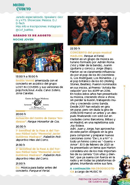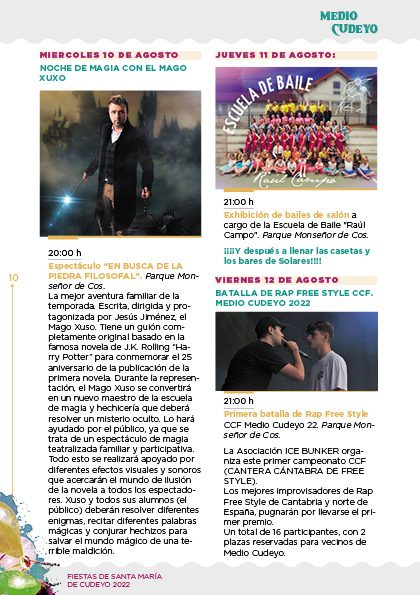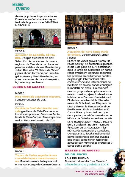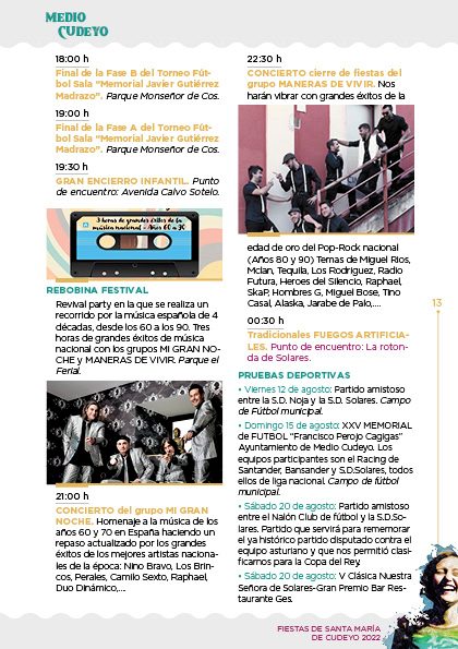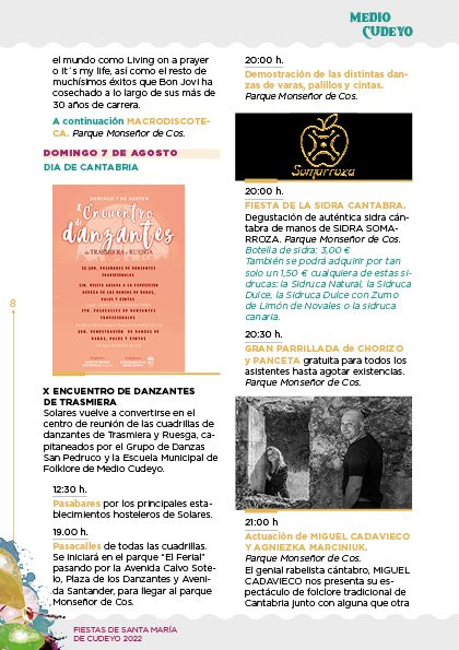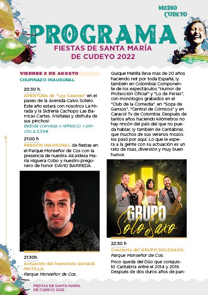 Detalles de EventoDate: 5 – 14 agosto, 2022Lugar de encuentro: Santa Maria de CudeyoCategorías: Fiesta, Fiestas localesEtiquetas: fiestas locales, fiestas populares, Santa María de CudeyoFiestas de Santa María de Cudeyo 2022 Eventos que pueden interesarte:Fiestas Bernales 2025 ¿Nos ayudas a mantener miplanhoy.com?Mantener miplanhoy.com no es fácil y gracias a tu donación podremos seguir informándote de los eventos y planes para hacer en Cantabria. SUSCRÍBETESuscríbete a nuestro boletín de noticias y entérate de los mejores eventos y actividades en Cantabria Correo electrónico Please wait... Suscribirte ¡Gracias por suscribirte! QUÉ HACER EN CANTABRIA…HoyMañanaEl fin de semanaEl viernesEl sábadoEl domingoEsta semanaElegir un día diciembre 2025LMXJVSD 1 2 3 4 5 6 7 8 9 10 11 12 13 14 15 16 17 18 19 20 21 22 23 24 25 26 27 28 29 30 31 « Nov Ene » MERCADILLOS SEMANALES EN CANTABRIAMercados en Cantabria durante la semana TE INTERESAHoróscopo 10 de Marzo 2024Dónde celebrar la Feria de Abril en Cantabria 2024Programación Sala Niagara Febrero 2024CARTELERASSALAS DE CONCIERTOSala NiagaraRock-Beer The New