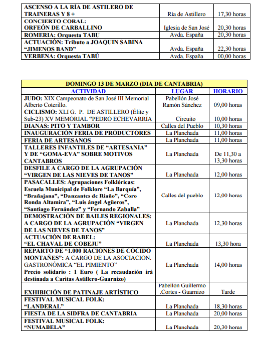 Una de las novedades de este año, es la jornada- homenaje a «Cantabria y sus tradiciones”, programada para el domingo 13 de marzo. “Se ha diseñado un recorrido para que desde primera hora de la mañana las calles del municipio se llenen de colorido con el pasacalles protagonizado por diversas agrupaciones folclóricas y musicales de la región”. A ello se suma en la zona de La Planchada, la I Feria de productores de Cantabria, así como una exhibición de la artesanía tradicional. No faltará la gastronomía con el reparto de 1000 raciones de cocido montañés al precio solidario de 1 euro y cuya recaudación se entregará a Caritas Astillero-Guarnizo; la fiesta de la Sidra cántabra y para cerrar la jornada un concierto de música folk a cargo de “Landeral” y “Numabela”. Tampoco faltará la diversión para los más pequeños a través de talleres de artesanía y goma-eva para el diseño de motivos cántabros, entre otros actos programados.