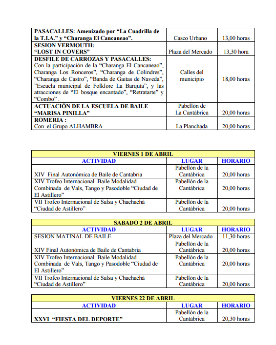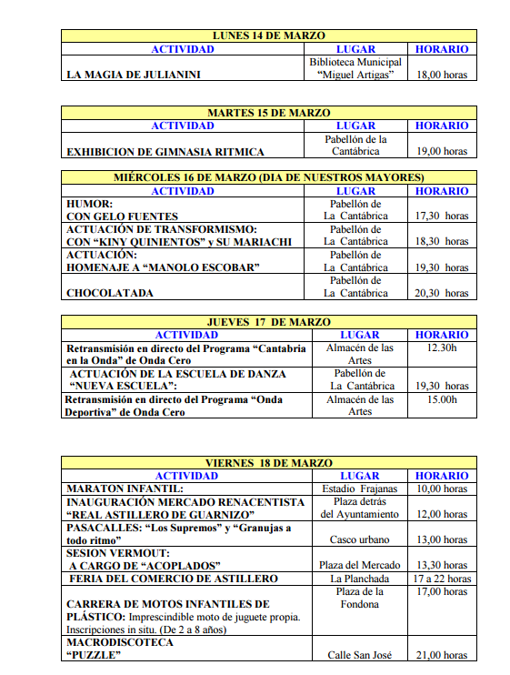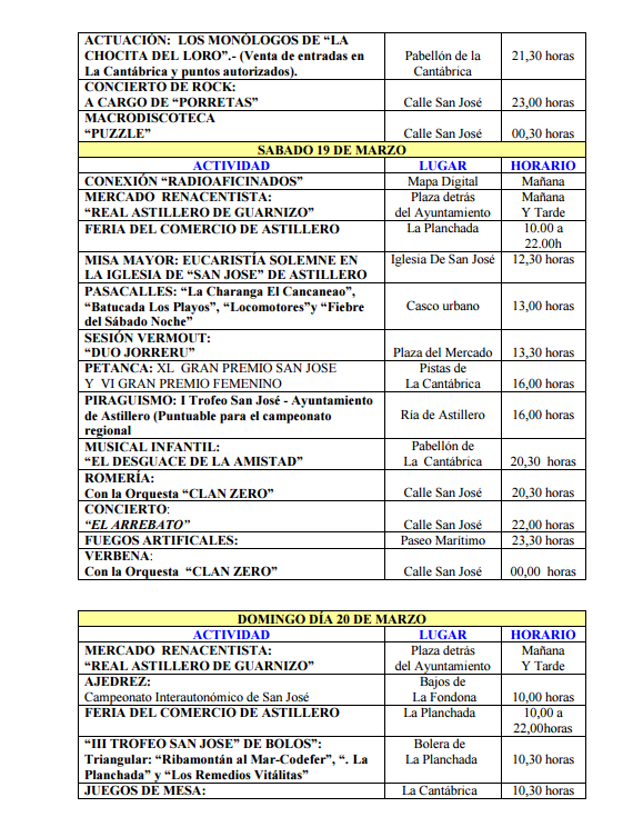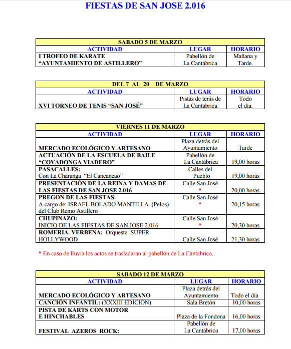 El viernes 11 de marzo arrancarán las fiestas de San José con el tradicional pregón desde el balcón de la casa consistorial, que correrá a cargo del remero srael Bolado . Previamente las calles del municipio ya respirarán el ambiente festivo amenizado por la charanga El Cancaneao. Tras el pregón y el chupinazo de salida de las fiestas, la orquesta Superhollywwod pondrá la nota musical en la calle san José.