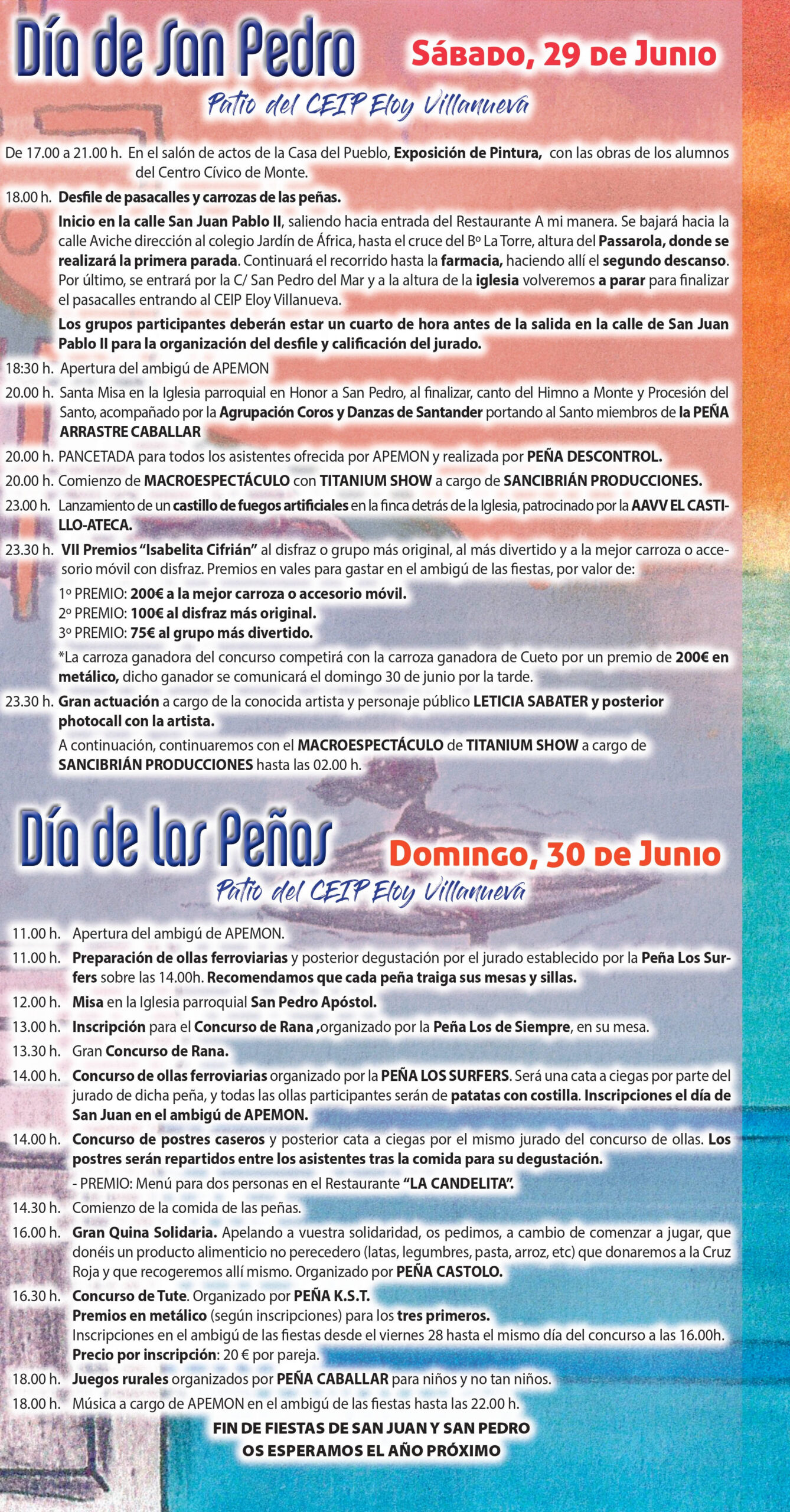 - 20:00 Santa Misa en honor a San Pedro seguida del canto del Himno a Monte y Procesión del Santo.