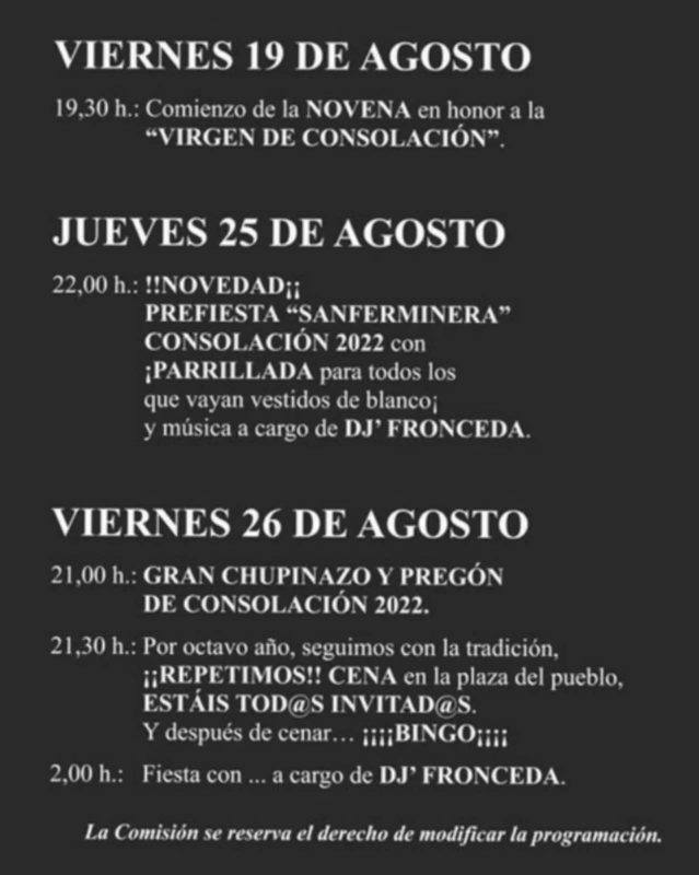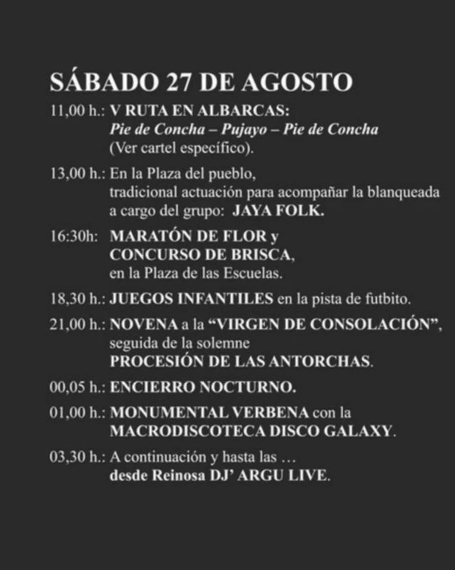 Detalles de Evento Este evento terminó el 28 agosto 2022 Lugar de encuentro: Pie de Concha Categorías: Fiesta, Fiestas locales, Niños Etiquetas: actividades con niños, actividades para niños, fiestas locales, fiestas populares, niños, Pie de Concha Grandes Fiestas de Nuestra Señora de la Consolación 2022 – Pie de Concha ¿Nos ayudas a mantener miplanhoy.com?Mantener miplanhoy.com no es fácil y gracias a tu donación podremos seguir informándote de los eventos y planes para hacer en Cantabria. SUSCRÍBETESuscríbete a nuestro boletín de noticias y entérate de los mejores eventos y actividades en Cantabria Correo electrónico Please wait... Suscribirte ¡Gracias por suscribirte! QUÉ HACER EN CANTABRIA…Hoy Mañana El fin de semana El viernes El sábado El domingo Esta semana Elegir un día febrero 2026 LMXJVSD 1 2 3 4 5 6 7 8 9 10 11 12 13 14 15 16 17 18 19 20 21 22 23 24 25 26 27 28 « Ene Mar » MERCADILLOS SEMANALES EN CANTABRIAMercados en Cantabria durante la semana TE INTERESA Horóscopo 10 de Marzo 2024 Dónde celebrar la Feria de Abril en Cantabria 2024 Programación Sala Niagara Febrero 2024 CARTELERASSALAS DE CONCIERTOSala NiagaraRock-Beer The New