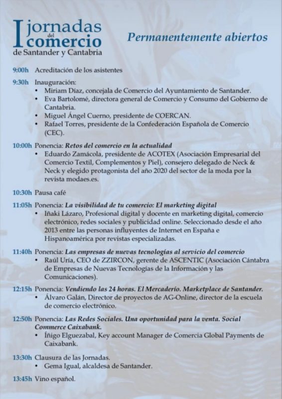 11:40h Ponencia: Las empresas de nuevas tecnologías al servicio del comercio ‘ Raúl Uría, CEO de ZZIRCON, gerente de ASCENTIC (Asociación Cántabra de Empresas de Nuevas Tecnologías de la Información y las Comunicaciones).
