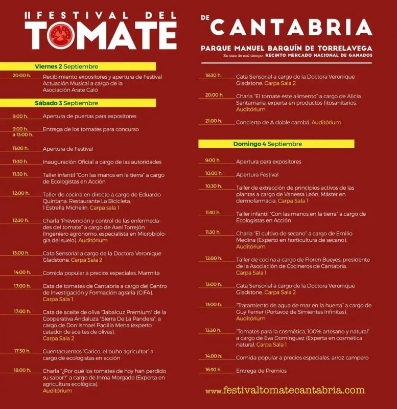 Detalles de EventoDate: 2 – 4 septiembre, 2022Lugar de encuentro: Ayuntamiento de TorrelavegaCategorías: Fiesta, Fiestas locales, GastronomíaEtiquetas: fiestas locales, fiestas populares, Gastronomía, TorrelavegaII Festival del Tomate de Cantabria ¿Nos ayudas a mantener miplanhoy.com?Mantener miplanhoy.com no es fácil y gracias a tu donación podremos seguir informándote de los eventos y planes para hacer en Cantabria. SUSCRÍBETESuscríbete a nuestro boletín de noticias y entérate de los mejores eventos y actividades en Cantabria Correo electrónico Please wait... Suscribirte ¡Gracias por suscribirte! QUÉ HACER EN CANTABRIA…HoyMañanaEl fin de semanaEl viernesEl sábadoEl domingoEsta semanaElegir un día noviembre 2025LMXJVSD 1 2 3 4 5 6 7 8 9 10 11 12 13 14 15 16 17 18 19 20 21 22 23 24 25 26 27 28 29 30« Oct Dic » MERCADILLOS SEMANALES EN CANTABRIAMercados en Cantabria durante la semana TE INTERESAHoróscopo 10 de Marzo 2024Dónde celebrar la Feria de Abril en Cantabria 2024Programación Sala Niagara Febrero 2024CARTELERASSALAS DE CONCIERTOSala NiagaraRock-Beer The New
