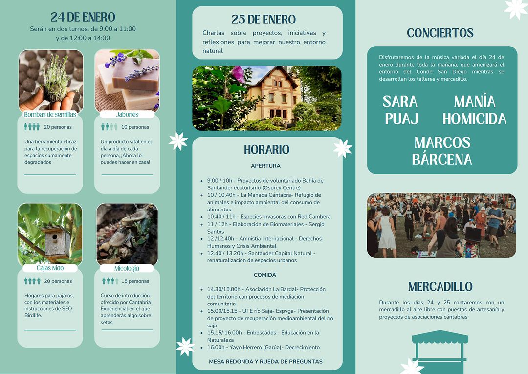 Detalles de EventoDate: 24 – 26 enero, 2024Lugar de encuentro: Cabezón de la SalCategorías: TalleresEtiquetas: Cabezón de la Sal, Jornadas Ambientales, talleresJornadas Ambientales de Cabezón de la Sal 2024 ¿Nos ayudas a mantener miplanhoy.com?Mantener miplanhoy.com no es fácil y gracias a tu donación podremos seguir informándote de los eventos y planes para hacer en Cantabria. SUSCRÍBETESuscríbete a nuestro boletín de noticias y entérate de los mejores eventos y actividades en Cantabria Correo electrónico Please wait... Suscribirte ¡Gracias por suscribirte! QUÉ HACER EN CANTABRIA…HoyMañanaEl fin de semanaEl viernesEl sábadoEl domingoEsta semanaElegir un día noviembre 2025LMXJVSD 1 2 3 4 5 6 7 8 9 10 11 12 13 14 15 16 17 18 19 20 21 22 23 24 25 26 27 28 29 30« Oct Dic » MERCADILLOS SEMANALES EN CANTABRIAMercados en Cantabria durante la semana TE INTERESAHoróscopo 10 de Marzo 2024Dónde celebrar la Feria de Abril en Cantabria 2024Programación Sala Niagara Febrero 2024CARTELERASSALAS DE CONCIERTOSala NiagaraRock-Beer The New