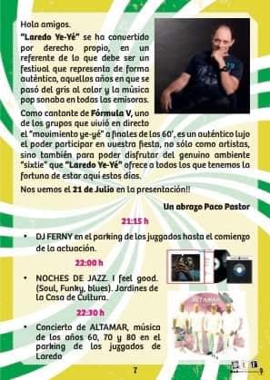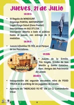 Detalles de EventoDate: 21 – 24 julio, 2022Lugar de encuentro: LaredoCategorías: Actuaciones, Espectáculos, Música y conciertosEtiquetas: actuaciones, espectáculos, Laredo, músicaLaredo Ye-Ye 2022 Eventos que pueden interesarte:Concierto La M.O.DA Santander 2025Concierto The Spitters Santander 2025Mercado de Navidad de Sarón 2025 – Programa completo del 5 al 8 de diciembre en Santa María de CayónIII Mercado de Navidad Laredo 2025 ¿Nos ayudas a mantener miplanhoy.com?Mantener miplanhoy.com no es fácil y gracias a tu donación podremos seguir informándote de los eventos y planes para hacer en Cantabria. SUSCRÍBETESuscríbete a nuestro boletín de noticias y entérate de los mejores eventos y actividades en Cantabria Correo electrónico Please wait... Suscribirte ¡Gracias por suscribirte! QUÉ HACER EN CANTABRIA…HoyMañanaEl fin de semanaEl viernesEl sábadoEl domingoEsta semanaElegir un día diciembre 2025LMXJVSD 1 2 3 4 5 6 7 8 9 10 11 12 13 14 15 16 17 18 19 20 21 22 23 24 25 26 27 28 29 30 31 « Nov Ene » MERCADILLOS SEMANALES EN CANTABRIAMercados en Cantabria durante la semana TE INTERESAHoróscopo 10 de Marzo 2024Dónde celebrar la Feria de Abril en Cantabria 2024Programación Sala Niagara Febrero 2024CARTELERASSALAS DE CONCIERTOSala NiagaraRock-Beer The New
