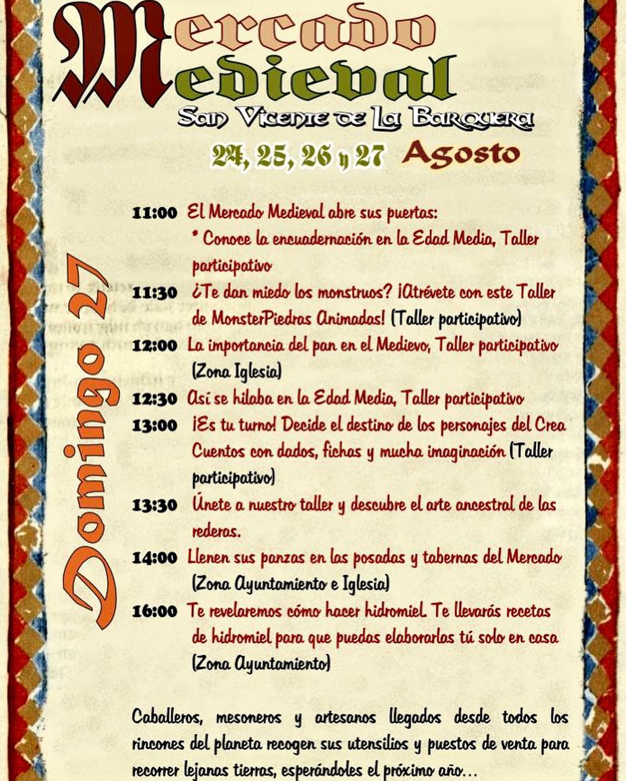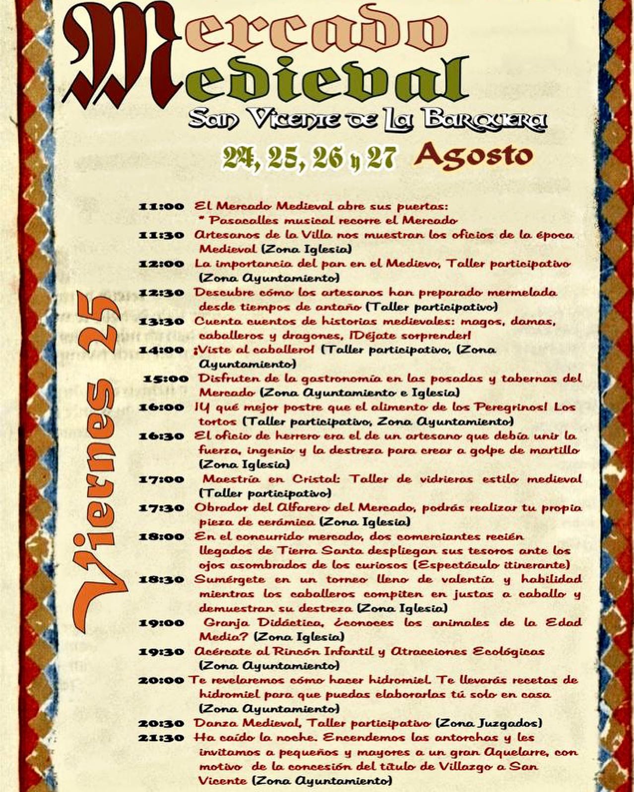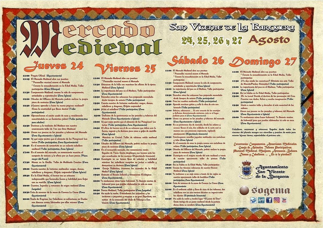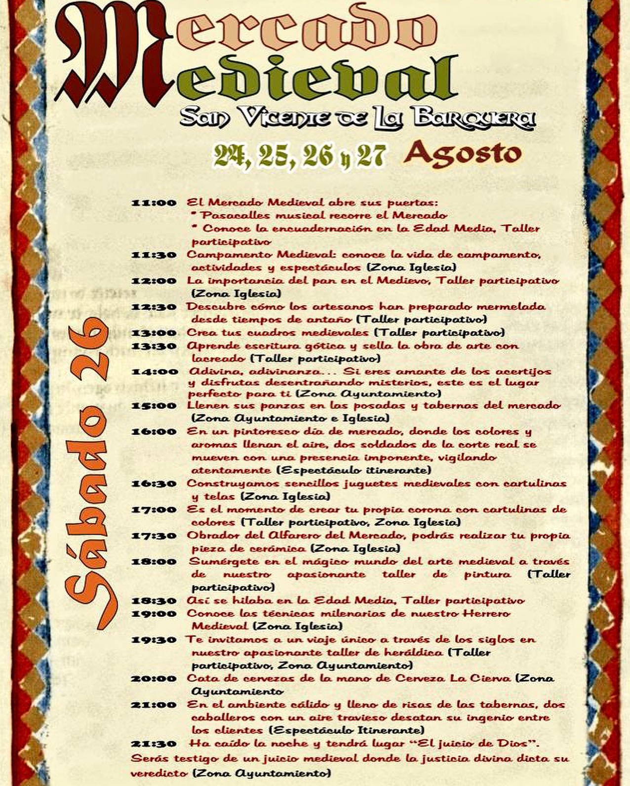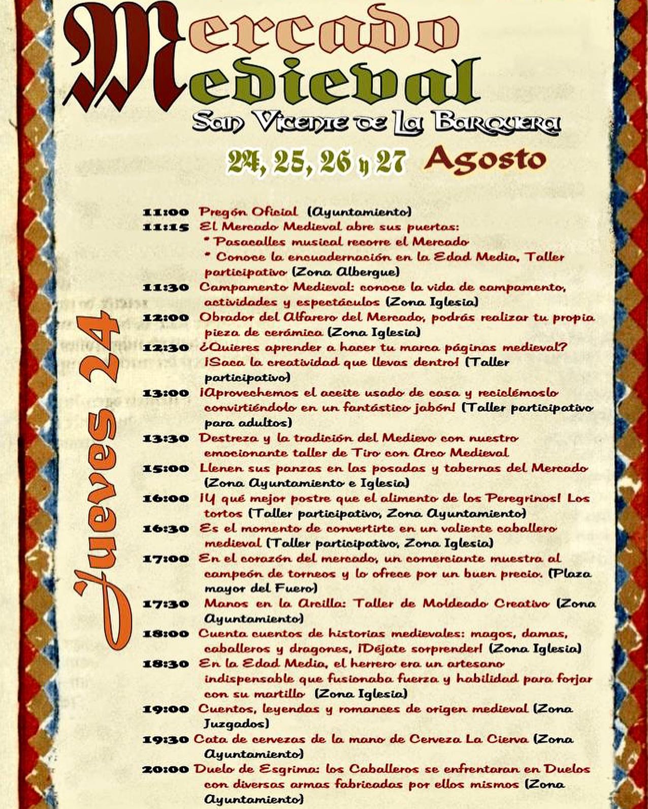 Detalles de Evento Date: 24 – 27 agosto, 2023 Lugar de encuentro: San Vicente de la Barquera Categorías: Mercadillos semanales Etiquetas: Mercado, mercado medieval, San Vicente de la Barquera Mercado Medieval San Vicente 2023 Programa Mercado Medieval San Vicente 2023 Eventos que pueden interesarte:Carnaval San Vicente de La Barquera 2026RUTA TUNEL DE LA ENGAÑACARTES CANÍBAL 2026Charla. " Mascaradas de invierno: rito, patrimonio y memoria”. ¿Nos ayudas a mantener miplanhoy.com?Mantener miplanhoy.com no es fácil y gracias a tu donación podremos seguir informándote de los eventos y planes para hacer en Cantabria. SUSCRÍBETESuscríbete a nuestro boletín de noticias y entérate de los mejores eventos y actividades en Cantabria Correo electrónico Please wait... Suscribirte ¡Gracias por suscribirte! QUÉ HACER EN CANTABRIA…Hoy Mañana El fin de semana El viernes El sábado El domingo Esta semana Elegir un día febrero 2026 LMXJVSD 1 2 3 4 5 6 7 8 9 10 11 12 13 14 15 16 17 18 19 20 21 22 23 24 25 26 27 28 « Ene Mar » MERCADILLOS SEMANALES EN CANTABRIAMercados en Cantabria durante la semana TE INTERESA Horóscopo 10 de Marzo 2024 Dónde celebrar la Feria de Abril en Cantabria 2024 Programación Sala Niagara Febrero 2024 CARTELERASSALAS DE CONCIERTOSala NiagaraRock-Beer The New