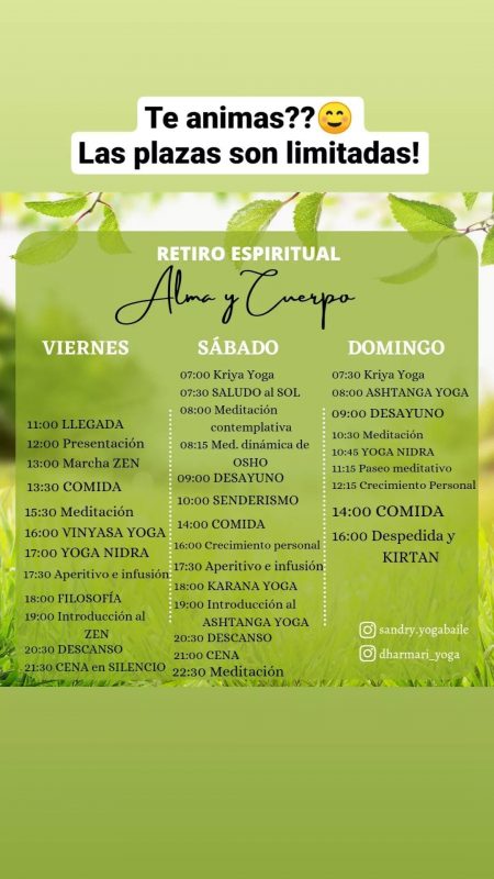 Detalles de EventoDate: 15 – 17 abril, 2022Lugar de encuentro: CantabriaCategorías: TalleresEtiquetas: Retiro, retiro espiritualRetiro Espiritual Alma y CuerpoEventos que pueden interesarte:Fiestas Barrio El Retiro 2025 en San Vicente de la Barquera – Programa CompletoFiestas Barrio El Retiro 2025 en San Vicente de la Barquera – Programa CompletoFiestas del Barrio El Retiro 2025San Andrés Luena 2025 ¿Nos ayudas a mantener miplanhoy.com?Mantener miplanhoy.com no es fácil y gracias a tu donación podremos seguir informándote de los eventos y planes para hacer en Cantabria. SUSCRÍBETESuscríbete a nuestro boletín de noticias y entérate de los mejores eventos y actividades en Cantabria Correo electrónico Please wait... Suscribirte ¡Gracias por suscribirte! QUÉ HACER EN CANTABRIA…HoyMañanaEl fin de semanaEl viernesEl sábadoEl domingoEsta semanaElegir un día diciembre 2025LMXJVSD 1 2 3 4 5 6 7 8 9 10 11 12 13 14 15 16 17 18 19 20 21 22 23 24 25 26 27 28 29 30 31 « Nov Ene » MERCADILLOS SEMANALES EN CANTABRIAMercados en Cantabria durante la semana TE INTERESAHoróscopo 10 de Marzo 2024Dónde celebrar la Feria de Abril en Cantabria 2024Programación Sala Niagara Febrero 2024CARTELERASSALAS DE CONCIERTOSala NiagaraRock-Beer The New