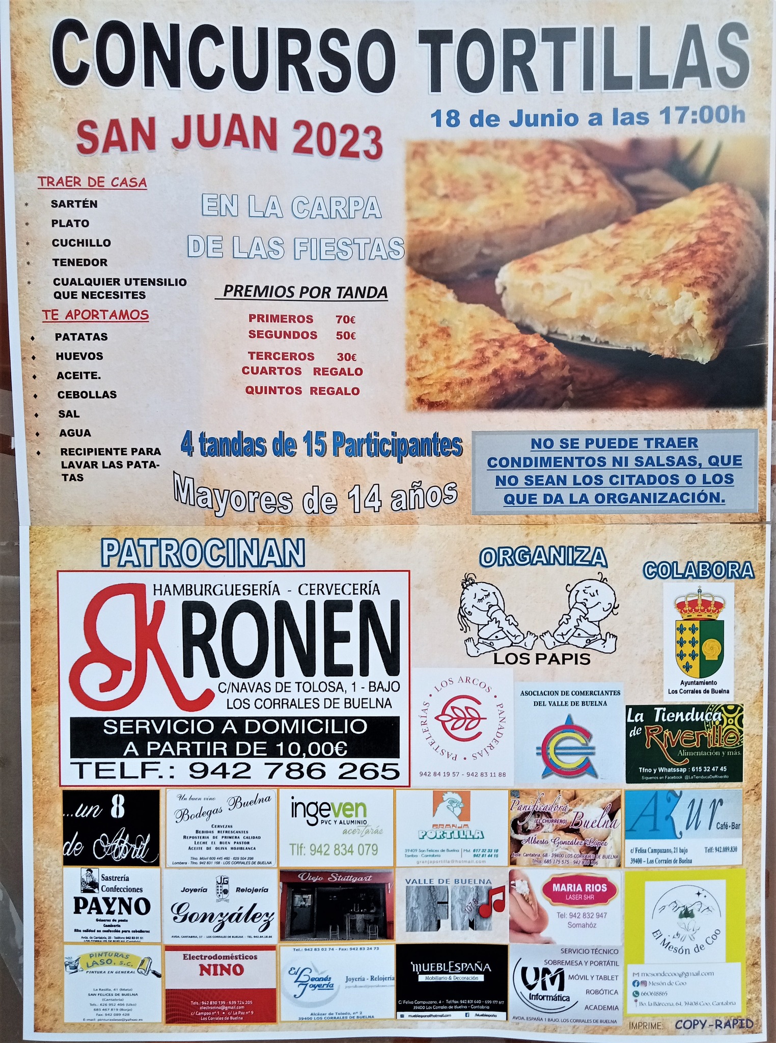 Detalles de Evento Date: 17 – 25 junio, 2023 Lugar de encuentro: Los Corrales de Buelna Categorías: Fiesta, Fiestas locales Etiquetas: Fiestas de San Juan 2023, fiestas locales, fiestas populares, Los Corrales de Buelna, san juan 2023 San Juan Los Corrales de Buelna 2023 Programa San Juan Los Corrales de Buelna 2023 ¿Nos ayudas a mantener miplanhoy.com?Mantener miplanhoy.com no es fácil y gracias a tu donación podremos seguir informándote de los eventos y planes para hacer en Cantabria. SUSCRÍBETESuscríbete a nuestro boletín de noticias y entérate de los mejores eventos y actividades en Cantabria Correo electrónico Please wait... Suscribirte ¡Gracias por suscribirte! QUÉ HACER EN CANTABRIA…Hoy Mañana El fin de semana El viernes El sábado El domingo Esta semana Elegir un día febrero 2026 LMXJVSD 1 2 3 4 5 6 7 8 9 10 11 12 13 14 15 16 17 18 19 20 21 22 23 24 25 26 27 28 « Ene Mar » MERCADILLOS SEMANALES EN CANTABRIAMercados en Cantabria durante la semana TE INTERESA Horóscopo 10 de Marzo 2024 Dónde celebrar la Feria de Abril en Cantabria 2024 Programación Sala Niagara Febrero 2024 CARTELERASSALAS DE CONCIERTOSala NiagaraRock-Beer The New