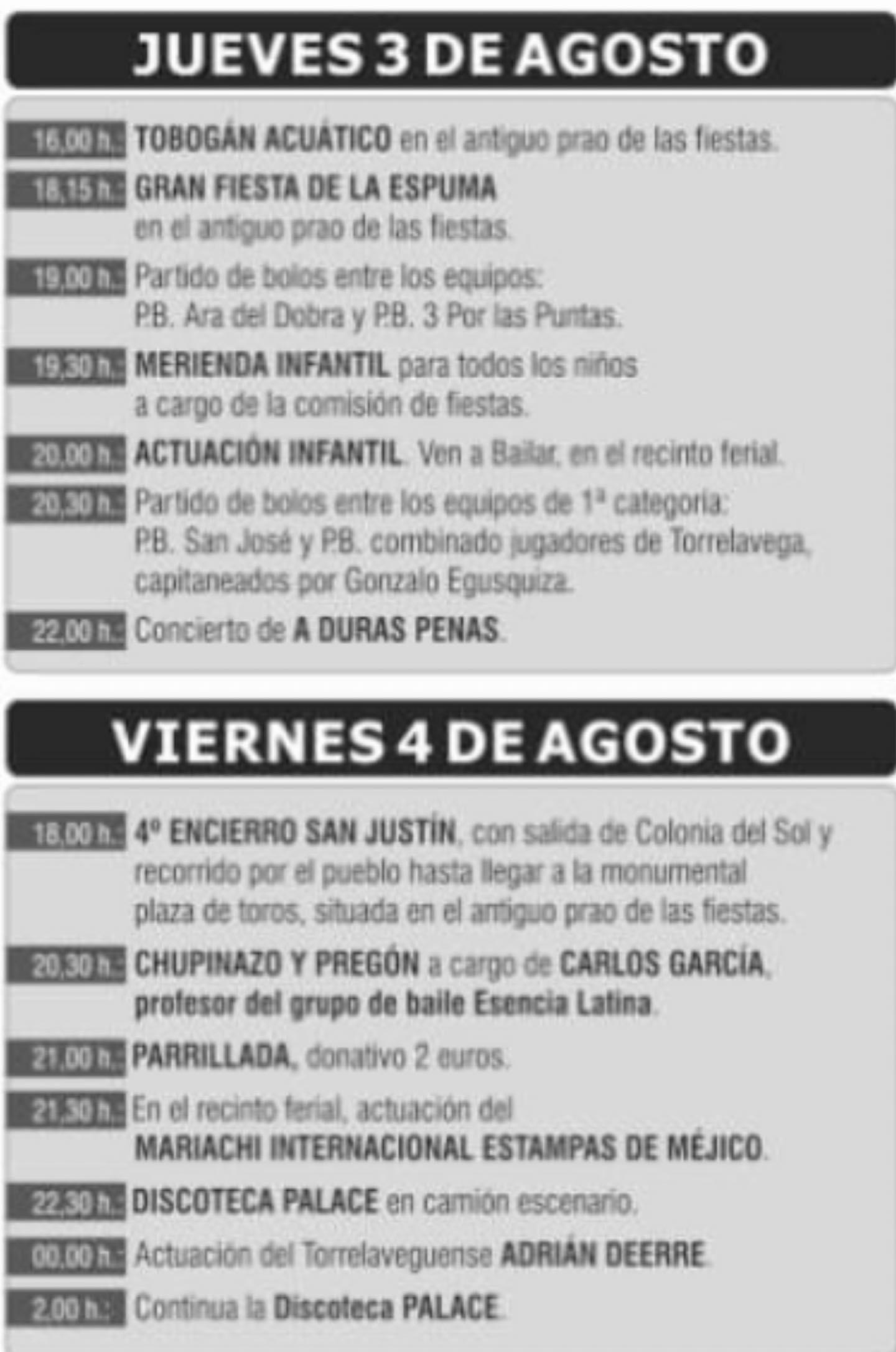 Detalles de Evento Date: 3 – 6 agosto, 2023 Categorías: Fiesta, Fiestas locales Etiquetas: fiestas locales, fiestas populares, San Justo y Pastor, San Justo y Pastor 2023, Sierrapando San Justo y Pastor Sierrapando 2023 Eventos que pueden interesarte:Raúl Quintana Quinteto presenta 'Riachuelo'Presentación libro Doctor MadrazoSantiago Mazarrasa presenta "Un poeta intrascendente""Planificando la salud de Cantabria", Óscar Fernández Torre ¿Nos ayudas a mantener miplanhoy.com?Mantener miplanhoy.com no es fácil y gracias a tu donación podremos seguir informándote de los eventos y planes para hacer en Cantabria. SUSCRÍBETESuscríbete a nuestro boletín de noticias y entérate de los mejores eventos y actividades en Cantabria Correo electrónico Please wait... Suscribirte ¡Gracias por suscribirte! QUÉ HACER EN CANTABRIA…Hoy Mañana El fin de semana El viernes El sábado El domingo Esta semana Elegir un día febrero 2026 LMXJVSD 1 2 3 4 5 6 7 8 9 10 11 12 13 14 15 16 17 18 19 20 21 22 23 24 25 26 27 28 « Ene Mar » MERCADILLOS SEMANALES EN CANTABRIAMercados en Cantabria durante la semana TE INTERESA Horóscopo 10 de Marzo 2024 Dónde celebrar la Feria de Abril en Cantabria 2024 Programación Sala Niagara Febrero 2024 CARTELERASSALAS DE CONCIERTOSala NiagaraRock-Beer The New