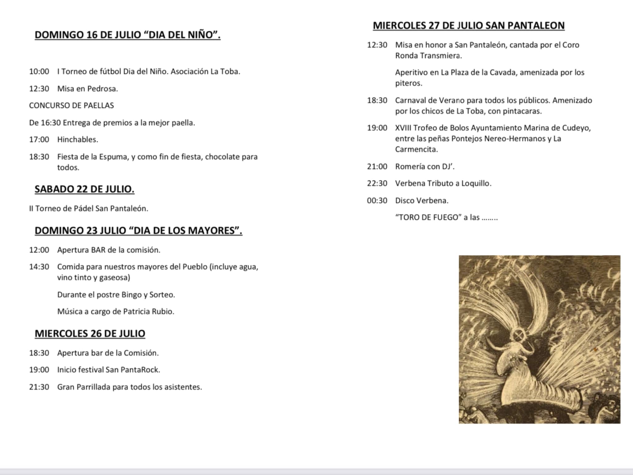 Detalles de EventoEste evento terminó el 27 julio 2023Lugar de encuentro: PontejosCategorías: Fiesta, Fiestas localesEtiquetas: fiestas locales, fiestas populares, Pontejos, San PantaleónSan Pantaleón Pontejos 2023Programa San Pantaleón Pontejos 2023 ¿Nos ayudas a mantener miplanhoy.com?Mantener miplanhoy.com no es fácil y gracias a tu donación podremos seguir informándote de los eventos y planes para hacer en Cantabria. SUSCRÍBETESuscríbete a nuestro boletín de noticias y entérate de los mejores eventos y actividades en Cantabria Correo electrónico Please wait... Suscribirte ¡Gracias por suscribirte! QUÉ HACER EN CANTABRIA…HoyMañanaEl fin de semanaEl viernesEl sábadoEl domingoEsta semanaElegir un día noviembre 2025LMXJVSD 1 2 3 4 5 6 7 8 9 10 11 12 13 14 15 16 17 18 19 20 21 22 23 24 25 26 27 28 29 30« Oct Dic » MERCADILLOS SEMANALES EN CANTABRIAMercados en Cantabria durante la semana TE INTERESAHoróscopo 10 de Marzo 2024Dónde celebrar la Feria de Abril en Cantabria 2024Programación Sala Niagara Febrero 2024CARTELERASSALAS DE CONCIERTOSala NiagaraRock-Beer The New