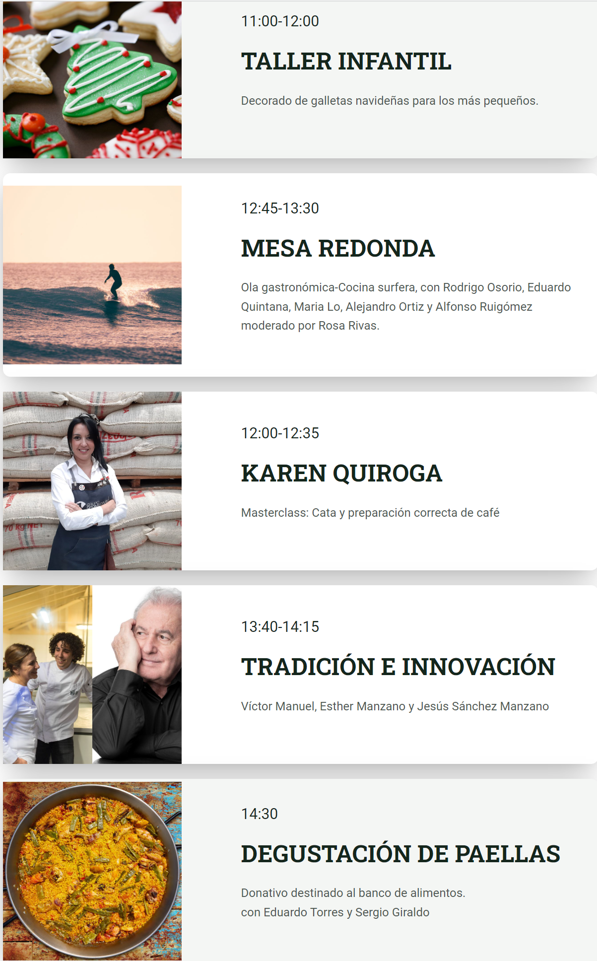 Detalles de EventoDate: 2 – 4 diciembre, 2022Lugar de encuentro: Plaza Alfonso XIIICategorías: GastronomíaEtiquetas: Gastronomía, Santander Foodie, talleresSantander Foodie 2022 – DiciembrePrograma Santander Foodie 2022Sábado MañanaSábado TardeDomingo Eventos que pueden interesarte:Rosalía LUX Tour 2026: Fechas, ciudades, entradas y todo lo que debes saberLa Gran Champanada Santander 2025"Retrato de un Albarquero"Taller de Navidad “Cuentavidad” en el Museo Etnográfico de Cantabria ¿Nos ayudas a mantener miplanhoy.com?Mantener miplanhoy.com no es fácil y gracias a tu donación podremos seguir informándote de los eventos y planes para hacer en Cantabria. SUSCRÍBETESuscríbete a nuestro boletín de noticias y entérate de los mejores eventos y actividades en Cantabria Correo electrónico Please wait... Suscribirte ¡Gracias por suscribirte! QUÉ HACER EN CANTABRIA…HoyMañanaEl fin de semanaEl viernesEl sábadoEl domingoEsta semanaElegir un día diciembre 2025LMXJVSD 1 2 3 4 5 6 7 8 9 10 11 12 13 14 15 16 17 18 19 20 21 22 23 24 25 26 27 28 29 30 31 « Nov Ene » MERCADILLOS SEMANALES EN CANTABRIAMercados en Cantabria durante la semana TE INTERESAHoróscopo 10 de Marzo 2024Dónde celebrar la Feria de Abril en Cantabria 2024Programación Sala Niagara Febrero 2024CARTELERASSALAS DE CONCIERTOSala NiagaraRock-Beer The New