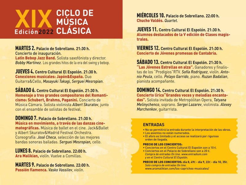 Detalles de EventoDate: 2 agosto, 2022 11:30 – 14 agosto, 2022 12:30Lugar de encuentro: El Espolón de ComillasCategorías: Música y conciertosEtiquetas: comillas, Conciertos, músicaXIX EDICIÓN DE LOS CAPRICHOS MUSICALES DE COMILLAS ¿Nos ayudas a mantener miplanhoy.com?Mantener miplanhoy.com no es fácil y gracias a tu donación podremos seguir informándote de los eventos y planes para hacer en Cantabria. SUSCRÍBETESuscríbete a nuestro boletín de noticias y entérate de los mejores eventos y actividades en Cantabria Correo electrónico Please wait... Suscribirte ¡Gracias por suscribirte! QUÉ HACER EN CANTABRIA…HoyMañanaEl fin de semanaEl viernesEl sábadoEl domingoEsta semanaElegir un día diciembre 2025LMXJVSD 1 2 3 4 5 6 7 8 9 10 11 12 13 14 15 16 17 18 19 20 21 22 23 24 25 26 27 28 29 30 31 « Nov Ene » MERCADILLOS SEMANALES EN CANTABRIAMercados en Cantabria durante la semana TE INTERESAHoróscopo 10 de Marzo 2024Dónde celebrar la Feria de Abril en Cantabria 2024Programación Sala Niagara Febrero 2024CARTELERASSALAS DE CONCIERTOSala NiagaraRock-Beer The New
